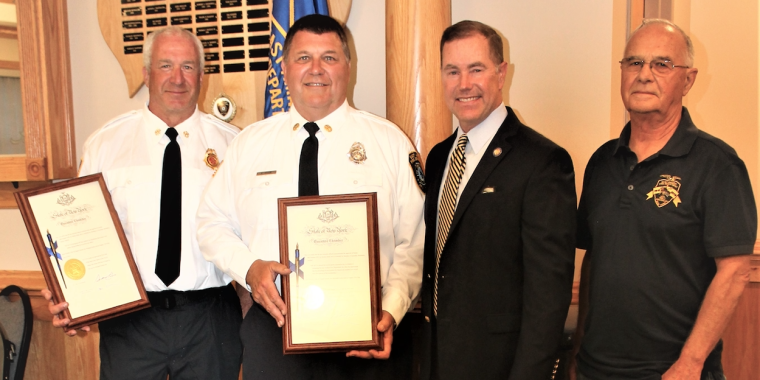 Amherst, NY – Senator Edward Rath joined members of the East Amherst Fire Department to present certificates commemorating legislation, Senate Bill S6702, incorporating the East Amherst Fire Department Benevolent Association and Senate Bill S6703, increasing the cap on members who can live outside the fire district, acknowledging both bills being signed into law.