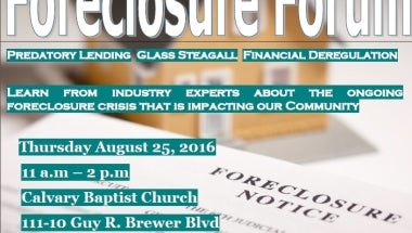 Southeast Queens was and remains the epicenter of the foreclosure crisis in New York State. Whether you have personally experienced issues with your home, this is an epidemic that affects our entire community and beyond. Please join us for a forum where we will hear from experts about Wall Street, predatory lending, financial deregulation and the role of the Glass-Steagall law. We will examine how the system created the conditions that led to the crash, and what we can do to recover.