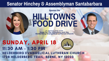 NYS Senator Michelle Hinchey and Assemblyman Angelo Santabarbara, in partnership with A Hug from the Hilltowns and Helderberg Lutheran Church, will be holding a drive-thru, drop-off food drive event from 11:00 AM to 1:00 PM on Saturday, April 18, at Helderberg Lutheran Church.
