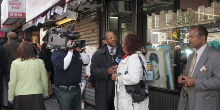 Councilmember Darlene Mealy, joined by NYS Senator Eric Adams’ Chief of Staff Ms. Ingrid Lewis-Martin and other community and civic leaders decry the double homicide on Utica Avenue, which left a father and son dead at a small bodega. Senator Adams remained in Albany on urgent Senate business.