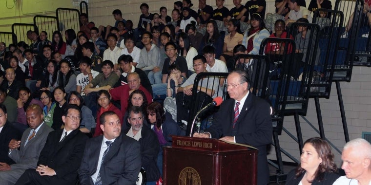 New York State Senator Frank Padavan (Queens) honored the JROTC Drill Team from Francis Lewis High School during a ceremony on Thursday evening May 28, 2009. The cadets finished in first place at the 27th Annual National High School Drill Team Championships in Daytona Beach, Florida. The team bested over 135 teams from across the country during the five day competition. The event is the most renowned and prestigious drill and ceremony competition in the world for high school JROTC drill programs. Senator Padavan praises the leadership, dedication and accomplishments of the Francis Lewis High School JROTC drill team during a ceremony honoring their first place finish in national competition.