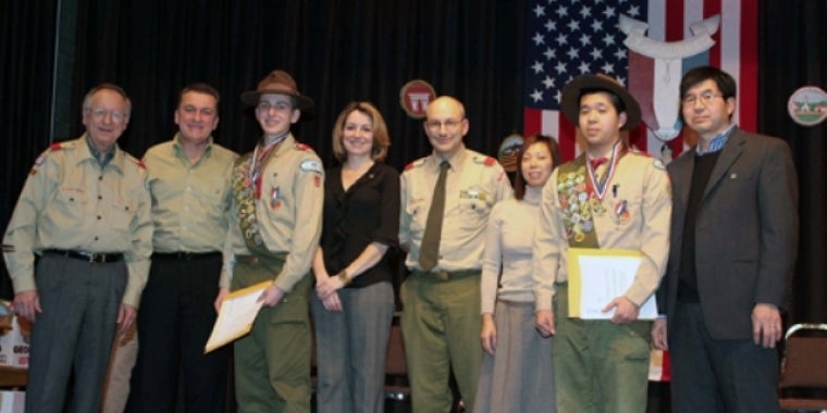 State Senator Frank Padavan (Queens) honored a pair of new Eagle Scouts from Troop 1 during a Court of Honor ceremony at Temple Beth Sholom in Flushing on Saturday February 7, 2009. Padavan presented the pair of young leaders with the New York State Senate Medal of Achievement and a Certificate of Merit in recognition of their accomplishments. Two years ago, Padavan was named as an honorary member of Troop 1, joining New York Yankee and baseball legend Babe Ruth as the only two individuals to be bestowed with the honor. Senator Padavan joins with (left to right) James Shannon, New Eagle Scout James Shannon Jr., Nancy Shannon, Troop 1 Scoutmaster Jack Baer, Wendy Lam, New Eagle Scout Ken Chan and Sin Chiu Chan following Troop 1’s Court of Honor ceremony on Saturday afternoon February 7, 2008.