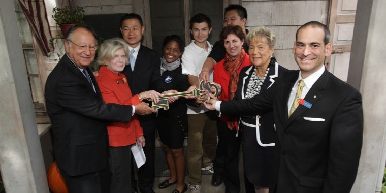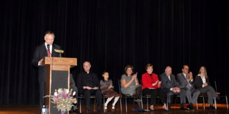 Senator Padavan addresses a capacity crowd of over 800 supporters and Northeast Queens residents at his swearing-in ceremony at Holy Cross High School in Bayside on February 15, 2009. Padavan was joined on stage by (left to right) Reverend Monsignor Raymond F. Chappetto, fourth-grader Brittany Chen, Mistress of Ceremonies and Community Leader Maria Collier, Margaret Abels, New York Supreme Court Justice Robert Hanophy, Rabbi Michael Ehrlich and Allison Padavan.