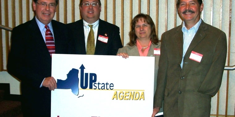 Senator Seward receives support for the Upstate NOW program from Custom Tool and Machine President John Piseck, Kwik-Kut President Mary Morse, and Hale Manufacturing President James Benson
