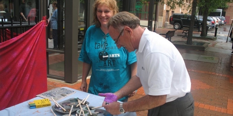 New York State Senator John A. DeFrancisco shows his support for the arts at a Central New York Arts Covenant launch on July 24, 2009. Senator DeFrancisco places his handprint on a quilt as a "signature" to show his support of the arts. The Covenant invites citizens to expand their understanding of the value of the arts in their lives.