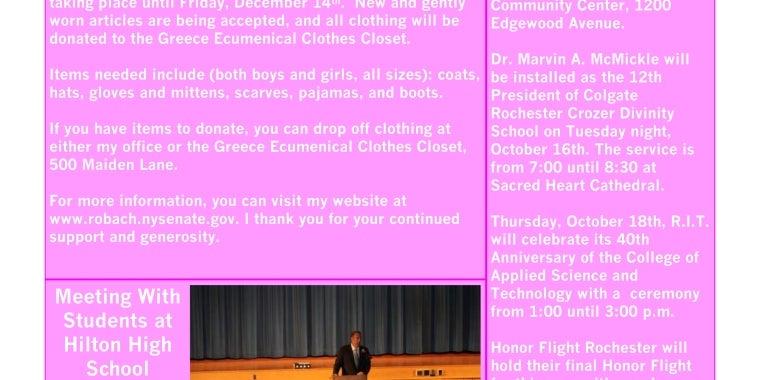 The students and faculty of school #42 were thrilled to have Senator Robach present them with a new flag for their school flag pole. The new flag came with a certificate of authenticity that it had been flown over the U.S.Capitol in Washington D.C.