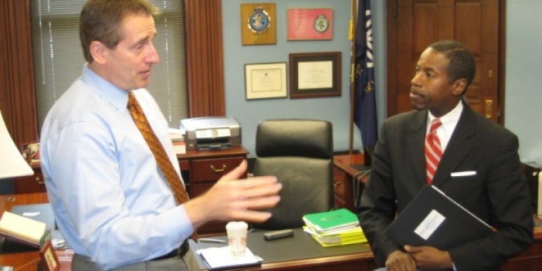 Senate Democratic Leader Malcolm A. Smith and Rochester Mayor Robert J. Duffy discuss a high-speed rail and other proposed economic development projects that will bring good jobs to upstate New York. The two leaders exchanged ideas during a recent meeting at Duffy's City Hall office. Sen. Smith was in Rochester to promote Right NY, an initiative that would create an estimated 25,000 new jobs.