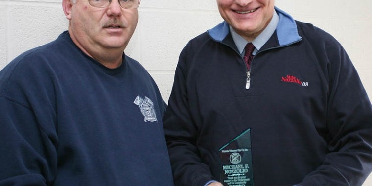 Moravia – New York State Senator Michael Nozzolio was honored by the Moravia Volunteer Fire Department for his support of the Department and the community. Pictured with Senator Mike Nozzolio is Assistant Chief Steve Mulvaney.