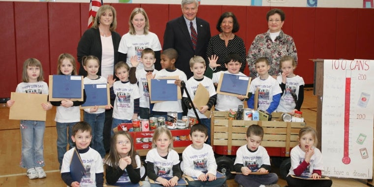 Newark - Senator Mike Nozzolio recently visited Perkins Elementary School in Newark where he recognized Stephanie Bounds' kindergarten class for their outstanding citizenship. The class collected canned goods and other nonperishable items for the Newark Food Closet. Senator Nozzolio presented each student with a special New York State Certificate acknowledging their efforts. Left to right are, front row: Preston Precourt, Maddison Snow, Madelenie Brownell, Joseph Shaw, Thomas Rivera, Lacey Boschetto. Middle row: Ashley Allegretti, Rachael Moynihan, Ciera Wilson, Matthew O'Connor, Jacob Wilkie, Joshua Logins, Joshua Scotti, Gabriel White, Riley Rice, Morgan Colacino. Back row: Sue Achille, Principal; Stephanie Bounds, kindergarten teacher; Senator Nozzolio; Dolly Velte and Mary Jo Fenyn, coordinators of Newark Food Bank.