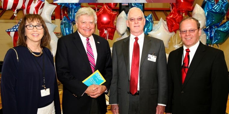 Pictured left to right are members of the Webster Police Department: Deb Hart, Pete Scorsone, Sal Simonetti, Senator Nozzolio, Joe Rieger, Webster Village Trustee Donna Rickard, and Dennis Kohlmeier.