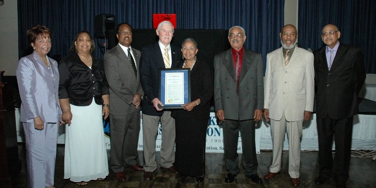 Pictured, from left to right, are: committee members Patricia Hill Williams, Ruby Hudson, Howard Randolph, Senator Johnson, President Alice T. Cone, Chesteau H. Howard, John Norris and Gala Chairman Jordan Wilson.