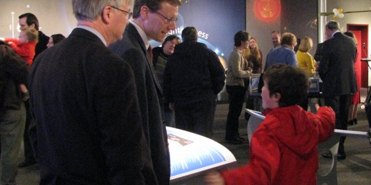 Senator Valesky tours the new Lockheed Martin Flight & Space exhibit at the MOST with Kirk Longo and MOST President Larry Leatherman.