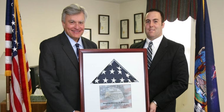 Auburn - Senator Mike Nozzolio was recently presented with a United States flag flown over Camp Phoenix in Kabul, Afghanistan during "Operation Enduring Freedom". Nick Wiwsianyk of Auburn was stationed at the camp and dedicated the special flag to Senator Nozzolio.