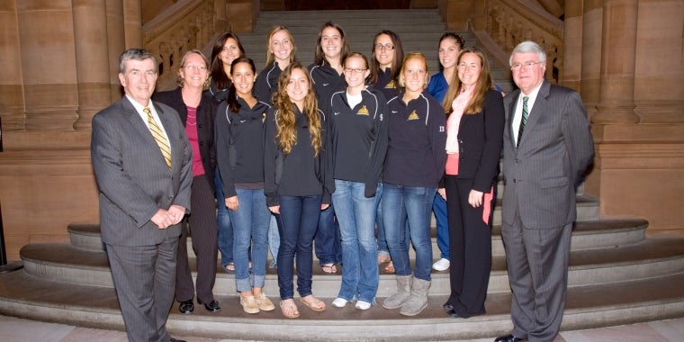 The College of Saint Rose Women’s Soccer Team was recently honored for their excellent sportsmanship and for reaching the national semifinals of the 2009 NCAA Women’s College Soccer Championships. The team is pictured here with Senator Breslin, President Mark Sullivan, and Head Coach Laurie Darling Gutheil.