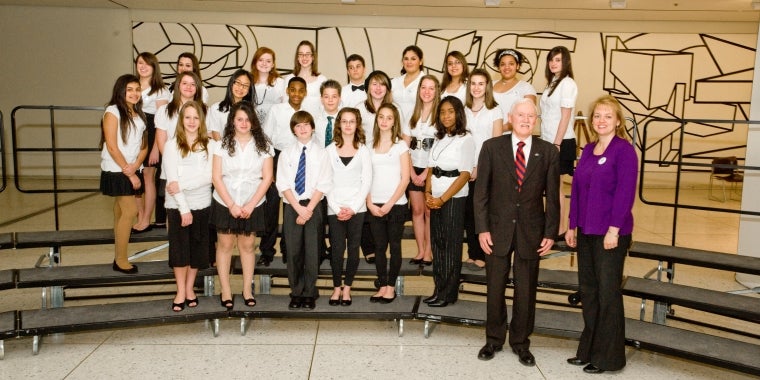 Photo includes members of the Robert Moses Middle School Select Chorus, Owen H. Johnson and Director Tina Buehler.