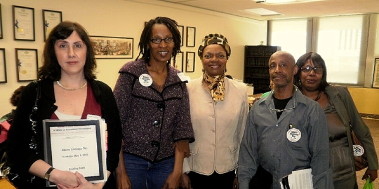 Senator Montgomery greets members of the Community Service Society of New York (CSS) during their visit to Albany. Pictured with the Senator (from l-r) are Melissa Kostvoski, Jean Blount, Victor Pate and Gail Douglas.