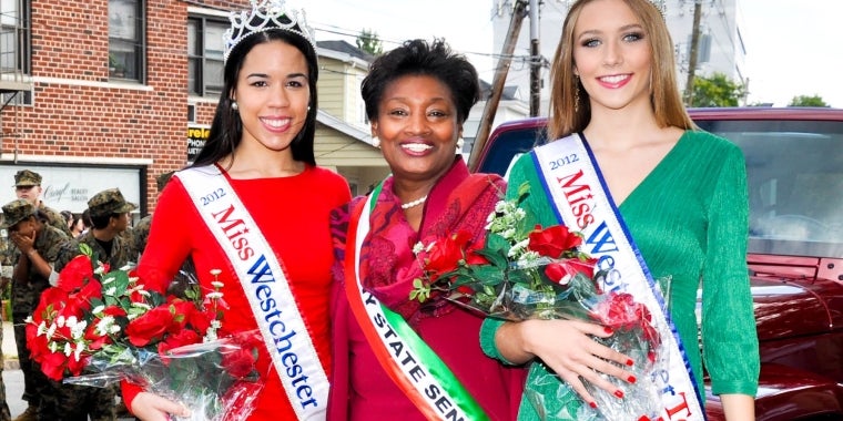 Joining thousands of parade-goers and marchers, Senator Andrea Stewart-Cousins took part in the 84th Annual Yonkers Columbus Day Parade. Organized by the Yonkers Columbus Day Celebration Committee the parade celebrates Italian heritage in the city of Yonkers and beyond. Marchers included dance and music performers as well as community groups and elected officials. During the parade, the Senator stopped for a picture with Miss Westchester and Miss Teen Westchester.