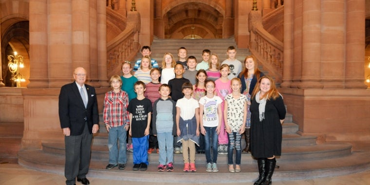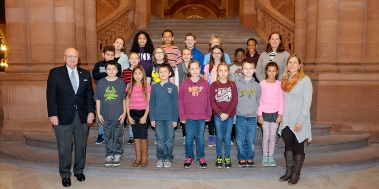 State Senator Hugh T. Farley (R, C, I - Schenectady) listened to the performance by the Fourth and Fifth Grade Chorus from Dorothy Nolan Elementary School, Saratoga Springs City School District, when they came to the Empire State Plaza Concourse in Albany as part of the New York State School Music Association’s "Music In Our Schools Month" on March 31st. The chorus performed under the direction of Deborah Craig and Mary Rocco.