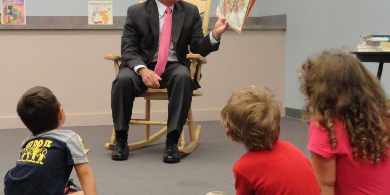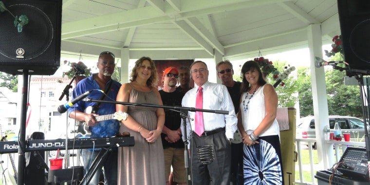 Senator DeFrancisco stands with Mike Behnke near the 9/11 Memorial Monument at Sheridan Park in Syracuse. The monument is etched with names and shields of first responders who died in the September 11th terrorist attacks.