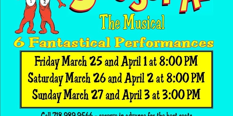 Jeff Samaha Theater Productions/The Ridge Chorale present “Seussical the Musical”, a theatrical extravaganza for the entire family. This show is presented with a cast of 52, a full orchestra of 19 pieces, and magnificent scenery at a family-friendly price! Please join us for this heartwarming musical – a show for young and old and every age in between. Performances are March 25th, 26th, 27th, April 1st, 2nd, & 3rd. Call 718 989-9566 for tickets or order online at www.jeffsamaha.com.