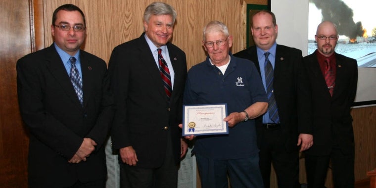 Pictured left to right are: Stephen DeChick, EMS Captain; Senator Mike Nozzolio, Honorary Member of the Oaks Corners Fire Department; Richard Day; Brian Maney, Fire Chief; and Shawn Fenner, Training Officer.