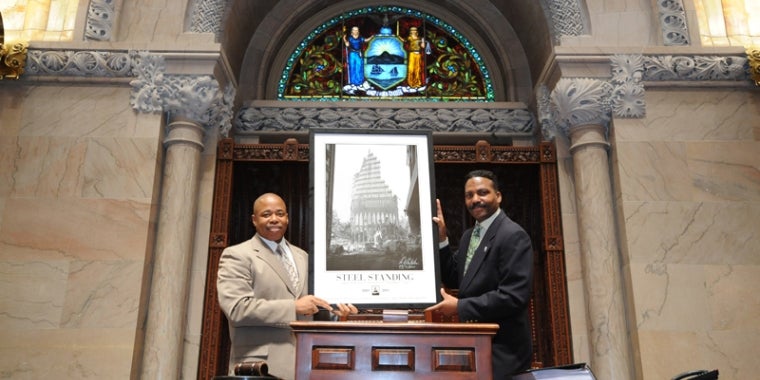 Senator Adams is joined with photographer Anthony Whitaker, and other elected officials of the NYS Senate. His photo, "Steel Standing" captured the World Trade Center after the devastating 911 attacks. The artist-graphic designer explains,“The physical essence was so strong, as if it was saying, ‘I am steel,’ because that’s what it was, and ‘I am standing,’ because that’s what it was doing. So, he named it ‘Steel Standing.’ “With a click of his camera, Whitaker, a Con Edison engineer by trade, documented the World Trade Center at the nation’s crossroads of devastation and determined resolve and heroism and hell on earth."