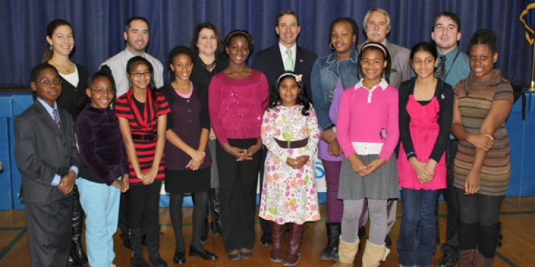 State Senator Jack Martins was back in Elmont to swear-in the new student government at Dutch Broadway School. Senator Martins spoke to the council and listened to their ideas on how to improve Dutch Broadway School in a town-hall style format. At the end of the discussion, new student President Lea Stewart, Vice President Marvia Pressoir and Secretary-Treasurer Hannah Meikle took the oath of office from Senator Martins as council members looked on. “All of the candidates worked very hard and did an incredible job talking about how they would improve Dutch Broadway School,” said Senator Martins adding, “I’m very proud of our officers and everyone who took part in the election.” Joining Senator Martins in swearing-in the new officers were Principal Walter Aksionoff and Student Council Advisor Mr. Verde.