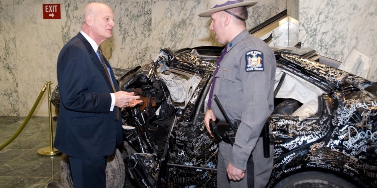 3/28/12 - Senator Saland speaks with a State Troooper who was staffing the distracted driving display and simulator set up in the LOB today. The display consists of a car that was involved in a serious accident caused by distracted driving. The nearly demolished car has been taken around to numerous schools and has been signed by students who have pledged not to text and drive. A good visual reminder with many proms, graduations and other functions happening in the coming months.