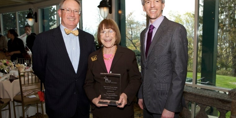 Senator Suzi Oppenheimer was recentinly honored by the Westchester Library System for her advocacy and leadership on behalf of the state's public libraries. Dave Donelson, of the WLS Board of Trustees and Terry Kirchner, Executive Director of WLS, present the award to Oppenheimer at an event on April 12, 2012.