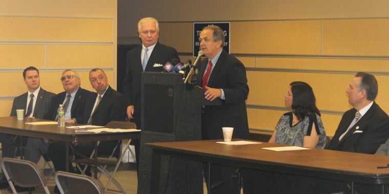 Lockport WWII veteran Ed Kolek was named to the French Legion of Honor during a special ceremony at the B. Leo Dolan American Legion Post #410 on Thursday, November 21, 2013. The award was instituted by Napoleon Bonaparte in 1802 to denote special service to France. Kolek piloted B-24 aircraft in 47 missions and contributed to the liberation of France. From left: State Senator George Maziarz, Kolek, Honorary French Consul Pascal Soares, and Assemblywoman Jane Corwin.