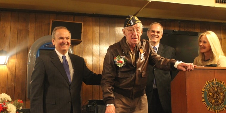 Lockport WWII veteran Ed Kolek was named to the French Legion of Honor during a special ceremony at the B. Leo Dolan American Legion Post #410 on Thursday, November 21, 2013. The award was instituted by Napoleon Bonaparte in 1802 to denote special service to France. Kolek piloted B-24 aircraft in 47 missions and contributed to the liberation of France. From left: State Senator George Maziarz, Kolek, Honorary French Consul Pascal Soares, and Assemblywoman Jane Corwin.