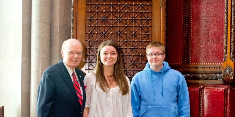 State Senator Hugh T. Farley (R - Schenectady) had the pleasure of meeting Kateryna Bob and Martin Thode, foreign exchange students currently attending Niskayuna High School, on April 15th in Albany. The students are pictured with the Senator on the Senate Chamber floors. They discussed New York State government and history.