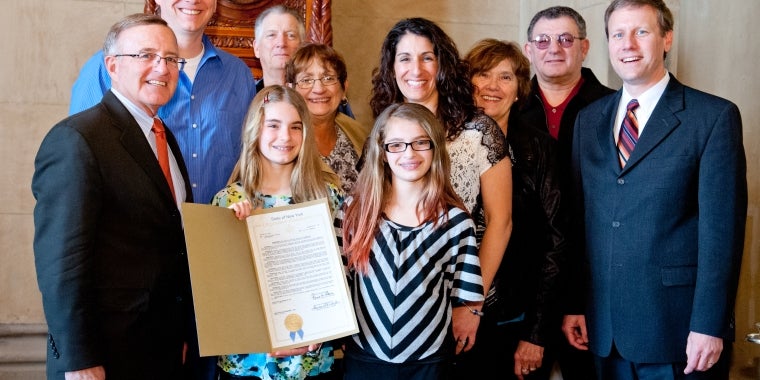 State Senator John A. DeFrancisco is pictured holding a Resolution with Liverpool student, Mari DeTota, in Senate Chambers on April 22, 2013. Mari won first place in the Elks Area 1 National Soccer Shoot-Out. Senator DeFrancisco, along with Senator David Valesky who is pictured on the right, passed a Resolution to congratulate and recognize Mari for her achievements. Mari's family accompained her to Albany for the presentation.