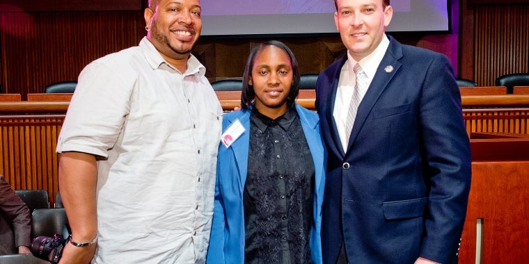 At an award ceremony held in Albany on May 7, 2013, Senator Lee M. Zeldin (R, C, I- Shirley) honored Erica Boynton of Brentwood as the 3rd Senate District’s 2013 New York State Senate “Woman of Distinction.” Erica was honored for her outstanding work in the prevention of gang violence in Suffolk County. She is also a founder of the Brentwood Association of Concerned Citizens and a leader of the successful anti-graffiti and neighborhood clean-up campaign in Brentwood. The Senate’s Women of Distinction program honors the exceptional achievement, personal excellence and outstanding, courageous and heroic actions on the part of individual women from across the State. Pictured here with Senator Zeldin (right) and Erica (Center) is Leonard Tucker, Jr. (Left), an active community leader in Brentwood and close friend of Ms. Boynton's.