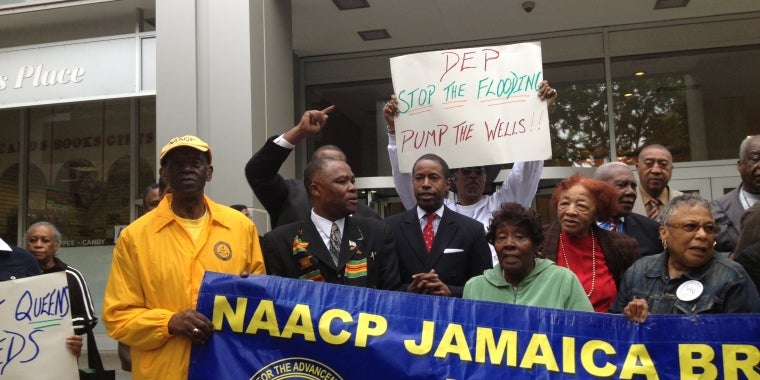 Flood Relief Rally at DEP Headquarters - May 24, 2013. Flooding is a serious problem affecting Southeast Queens. It is partially caused by an elevated groundwater table and the cessation of pumping at area wells, along with the lack of a fully constructed storm sewer system.
