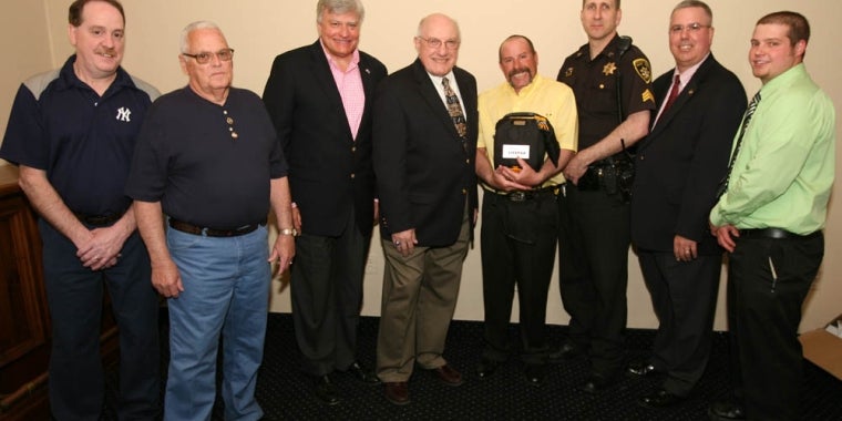 Pictured left to right are: Tim Jones; Bob Jones; Senator Mike Nozzolio; Chris Tertinek, Mayor of Sodus Point; Mark Jones, Chief of the Sodus Point Fire Department, Aaron DiSanto, Wayne County Sheriff’s Office Road Patrol Sergeant; Barry Virts, Wayne County Sheriff; and Mark Jones Jr.