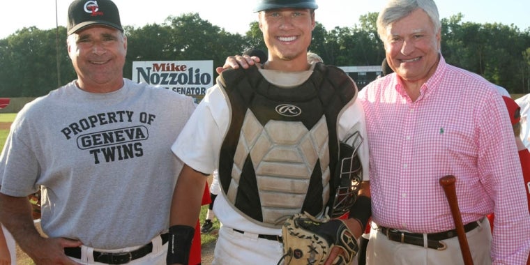 Pictured left to right are: Dave Herbst, Geneva Red Wings and Geneva Twins owner; Trey West, Geneva Twins catcher; and Senator Mike Nozzolio.