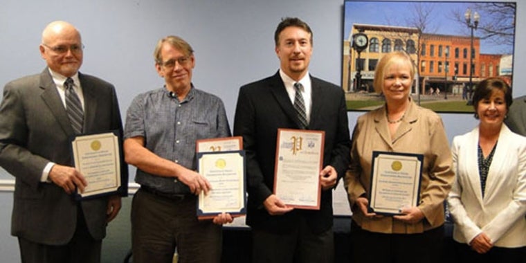 Community leaders recognized at this morning's event included, in the photo from left to right: Patrick Rogers, Executive Director of the Institute for Human Services; Michael Keane, Director of the Steuben County Office for the Aging; Mark Edgerly, Chairman of the Chemung Volunteer Action Corps; and Carol Houssock, Director of the Chemung Volunteer Action Corps. At the far right is Sharon Murphy, a representative from Congressman Tom Reed's office.