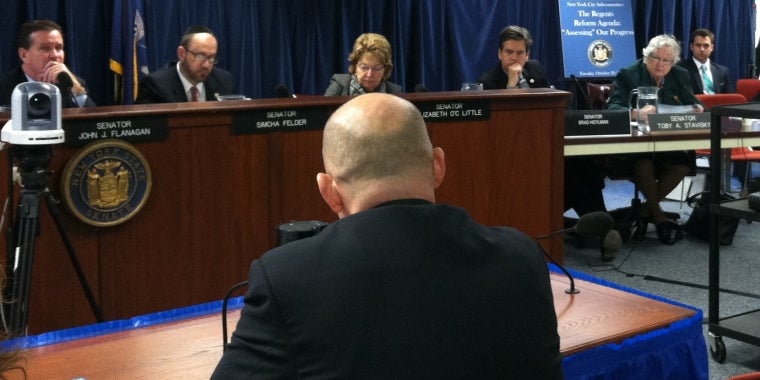 New York, NY—Senator Toby Ann Stavisky (D-Flushing) questions UFT President Michael Mulgrew during a Senate Education Committee hearing on the Regents’ Reform Agenda. Mulgrew spoke on the lack of a curriculum that conforms to the new Common Core State Standards as well as the danger in testing children in grades K-2.