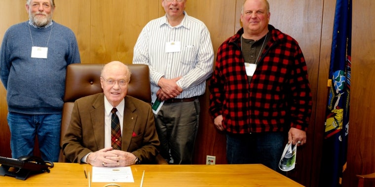 Fulton County Representatives for the Farm Bureau met with State Senator Hugh T. Farley (R, C, I – Schenectady) on March 4th in Albany to discuss legislation concerning agriculture. Included in the meeting (left to right) were Lee Hollenbeck, Clark Subik and Todd Rogers. Senator Farley is seated in the middle.