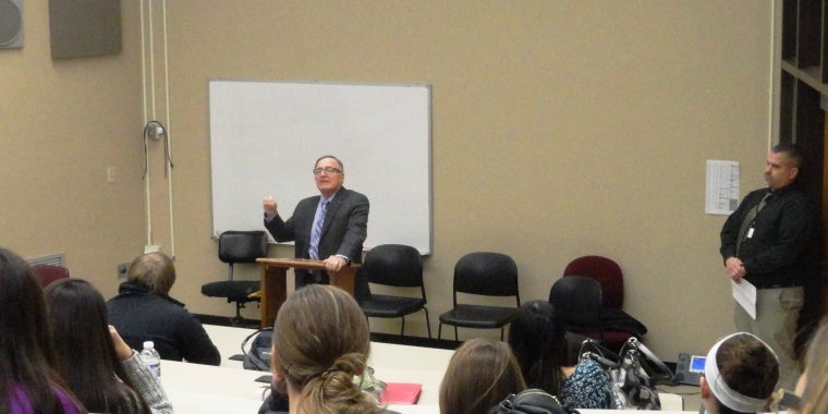 State Senator John A. DeFrancisco visited Auburn High School on December 15, 2014, to speak with high school seniors about state government and the legislative process. Senator DeFrancisco also talked about his role as Senator and about his family.