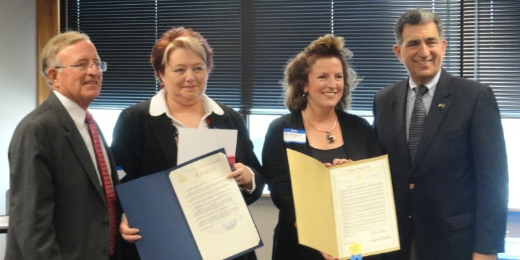 State Senator John A. DeFrancisco helped celebrate the 25th anniversary of the New York Relay Service on September 15, 2014. The New York Relay Service is a specialized call center located in Syracuse for deaf and hard of hearing individuals. Senator DeFrancisco is pictured with Joline Harris, Marybetth Mothersell and Assemblyman William Magnarelli. During the celebration, Senator DeFrancisco presented the New York Relay Service with a proclamation to recognize the center's milestone.