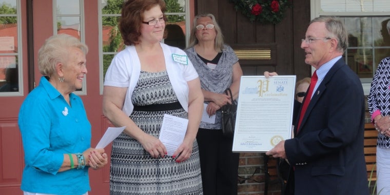 State Senator John A. DeFrancisco presented Hope for Bereaved Founder and Executive Director Therese Schoeneck with a proclamation to help commemorate the 35th anniversary of the organization. Hope for Bereaved held an open house and garden dedication at its main center at 4500 Onondaga Boulevard on June 24, 2014.
