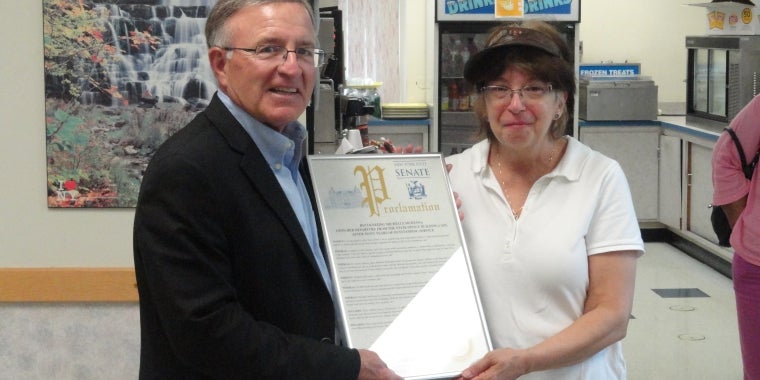 Senator John A. DeFrancisco presented Michelle McKenna with a proclamation to recognize her for her efforts on June 27, 2014. Michelle succesfully owned and operated the cafe located at the State Office Building in Syracuse for nearly 14 years.