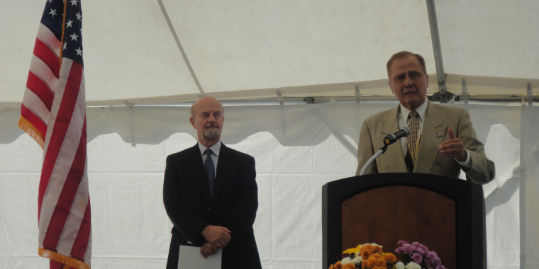 Senator Bonacic speaks at the ribbon-cutting ceremony for the new Oak Ridge Apartments in the Town of Wallkill. This $16.8 million project was a collaboration between Occupations, Inc., and Warwick developer Jonah Mandelbaum, who generously donated the housing project to Occupations for $3. This apartment complex will offer 77 affordable units, including 15 for people with developmental disabilities. (At left is James B. DeStefano, President of Occupations System of Care.)