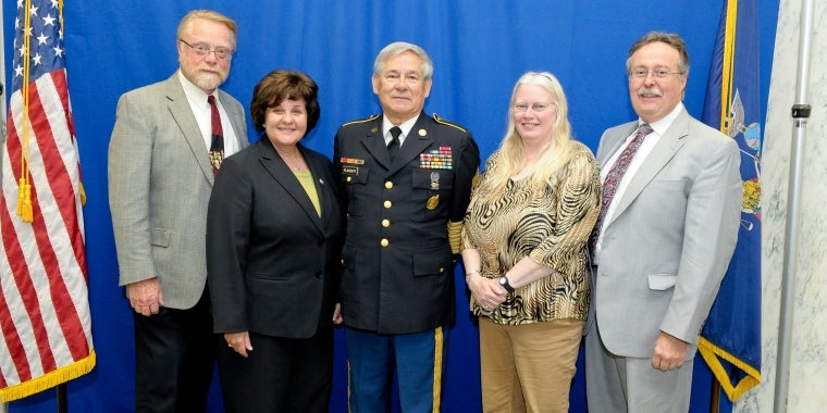 SSenator Kathy Marchione (second from left) is pictured standing with United States Army Veteran Gary Flaherty (center) and his wife Tammy Flaherty (second from right). Mr. Flaherty was announced today as Senator Kathy Marchione’s 2014 inductee into the NYS Senate Veterans’ Hall of Fame. Joining Mr. Flaherty for today's recognition ceremony were Richard Howland Jr., (far left) who initially submitted Mr. Flaherty’s name and credentials to Senator Marchione for consideration as a potential Veterans’ Hall of Fame inductee, and Columbia County Judge Jonathon Nichols (far right).
