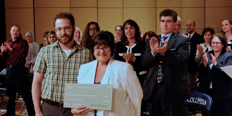 New York State Senator Kathy Marchione is pictured (center) during her recent "Teacher of Excellence" award ceremony held at Columbia High School in East Greenbush. During tonight's (June 5, 2014) ceremony, Senator Marchione congratulated 25 terrific teachers and thanked them for their service. Photo credit: Bruce McDonough
