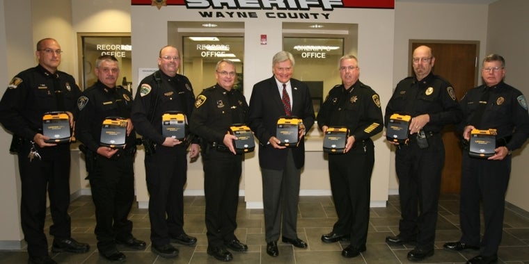 Lyons- Senator Mike Nozzolio recently met with Wayne County Sheriff Barry Virts and other members of Wayne County law enforcement to discuss the importance of having AED's (automated external defibrillators) in their vehicles. Senator Nozzolio was instrumental in securing the funding to purchase the AED's for the officers. The use of these AEDs will undoubtedly play a critical role in saving the lives of individuals who experience sudden cardiac arrest.