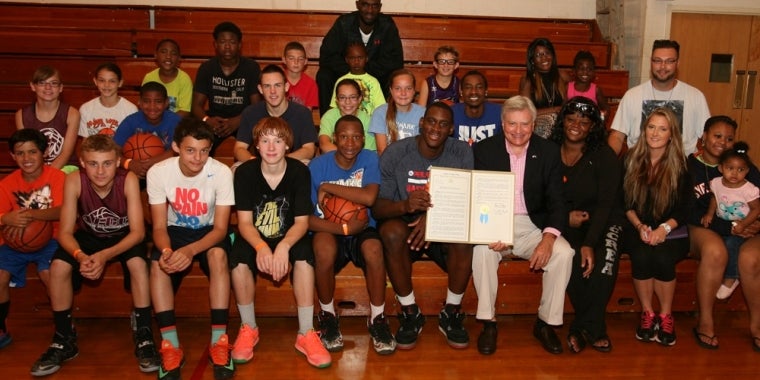 Pictured are: Senator Mike Nozzolio; Javon McCrea; Shannon McCrea, Javon’s mother; members of the coaching staff and campers.