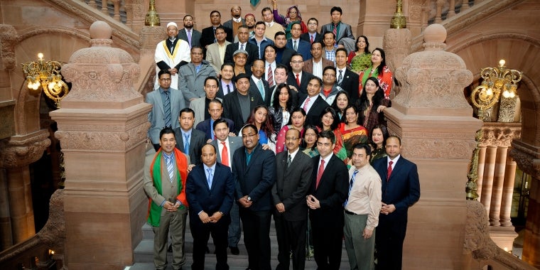 The Bangladesh Delegation gathers in the Million Dollar Staircase, along with Senator Díaz and Assemblyman Sepúlveda, New York State Capitol, March 25, 2014